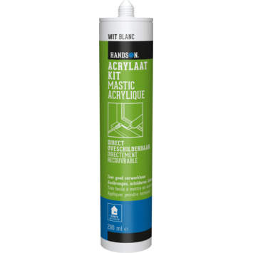 Handson acrylaatkit direct overschilderbaar 290 ml is een snel overschilderbare kit voor het afdichten van beperkte bewegingsvoegen. De kit is na 5 minuten al overschilderbaar. Enkel geschikt voor gebruik binnenshuis.