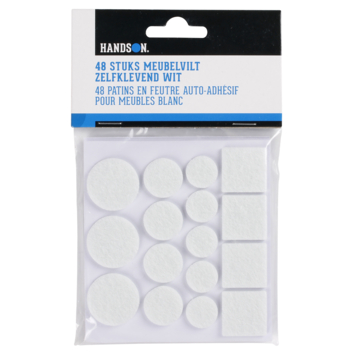 Het HANDSON anti krasvilt wordt gebruikt voor onder het meubilair en beschermt de vloer tegen krassen en andere beschadigingen door het verschuiven van het meubelstuk. Met het HANDSON meubelvilt wit wordt dat probleem verholpen. Het vilt is reeds voorzien van een zelfklevende laag zodat je het direct kunt plakken. De set bestaat uit 48 viltjes in de maatvoering 17mm (15 stuks), 21mm (12 stuks), 28mm (9 stuks) en 24x24mm (12 stuks). Allen uitgevoerd in de kleur wit.