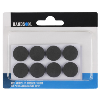 Met het HANDSON anti slip rubber kun je het verschuiven van je meubilair tegen gaan. Het anti slip rubber zorgt ervoor dat jouw meubels op hun plek blijven staan. Het is zelfklevend en blijft goed zitten. Het zwarte anti slip rubber heeft een ronde vorm met Ø18 mm. In de verpakking zitten 16 stuks. Het anti slip rubber werkt het best op een vlakke vloer.