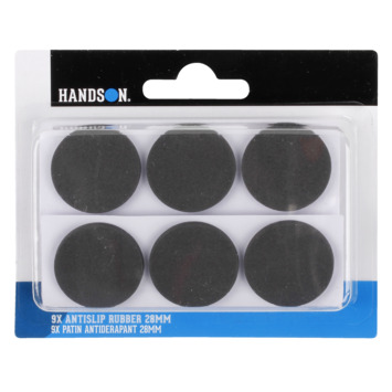 Met het HANDSON anti slip rubber kun je het verschuiven van je meubilair tegen gaan. Het anti slip rubber zorgt ervoor dat jouw meubels op hun plek blijven staan. Het is zelfklevend en blijft goed zitten. Het zwarte anti slip rubber heeft een ronde vorm met Ø28 mm. In de verpakking zitten 9 stuks. Het anti slip rubber werkt het best op een vlakke vloer.