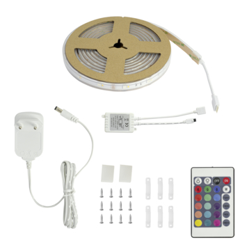 Breng kleur en sfeer in elke kamer met deze veelzijdige LED-strip. Deze strip biedt heldere en levendige RGB-kleuren, maar kan ook op warmwit (3000K) gezet worden. Hiermee eenvoudig aan te passen aan je stemming of gelegenheid. De LED strip is 3 meter lang en met de meegeleverde afstandsbediening te dimmen naar elk gewenste stand. Met een IP44-waarde is deze LED-strip geschikt voor in de badkamer of keuken. De adapter heeft een IP20-waarde waardoor de LED-strip alleen geschikt is voor binnengebruik. Eenvoudige installatie, want de LED strip is voorzien van een plakstrip over de gehele lengte. De LED strip is niet in te korten!