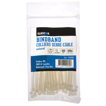 Het Handson bindband naturel 2.5 x 100 mm 100 stuks is geschikt voor het verbinden van onder andere draden en snoeren. U kunt de naturelkleurige bindbandjes, ookwel tiewrap of kabelbinder genoemd, ook gebruiken in combinatie met de bevestigingsplaat voor bindbandjes.