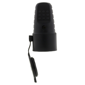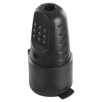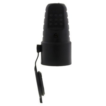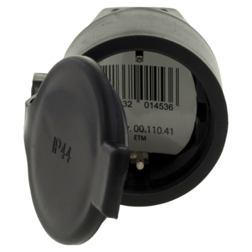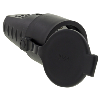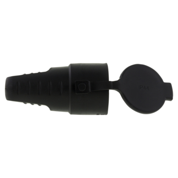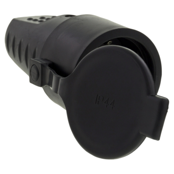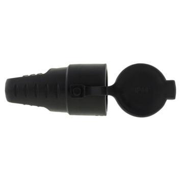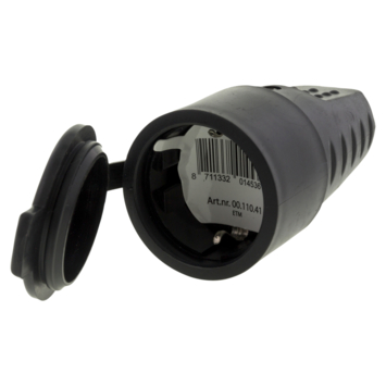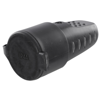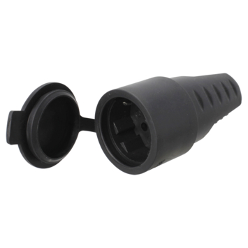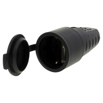 Contrastekker met randaarde rubber zwart, voor montage op een elektriciteitssnoer. Deze zwarte rubberen stekker is spatwaterdicht (beschermingsklasse IP44).