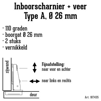 Dit inboorscharnier van HANDSON is een veelgebruikt type scharnier voor bijvoorbeeld keukenkastjes. Het scharnier wordt daarom ook wel een keukenkastscharnier genoemd. Doordat het scharnier is uitgerust met een veer blijft de kastdeur goed open staan en voel je enige weerstand bij het sluiten. Het inboren van het scharnier kan worden gedaan met een speciaal type houtboor, een zogenaamde komscharnierfrees met een diameter van 26 mm. Als je dit scharnier gebruikt als vervanging van een bestaand (kapot) scharnier dan is dat vanzelfsprekend niet nodig. Door middel van de stelschroeven heb je een fijnafstelling van voor naar achter en van links naar rechts zodat het deurtje altijd netjes sluit. Dit type scharnier (Type A) gebruik je bij volledig opliggende kastdeuren. In de verpakking zitten 2 scharnieren. Ben je op zoek naar een ander type scharnier dan vind je bij KARWEI ook een groot aantal andere scharnieren!