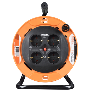 De Handson Kabelhaspel 4-voudig RA 25 Meter Oranje heeft een 25 meter lang verlengsnoer en biedt de mogelijkheid voor het inpluggen van 4 kabels. Afgerold kan er maximaal vermogen van 2300 Watt worden aangesloten, opgerold maximaal 750 Watt. De kabelhaspel is beveiligd tegen overbelasting. Met behulp van de stevige handgreep is het snoer eenvoudig op- en uit te rollen.