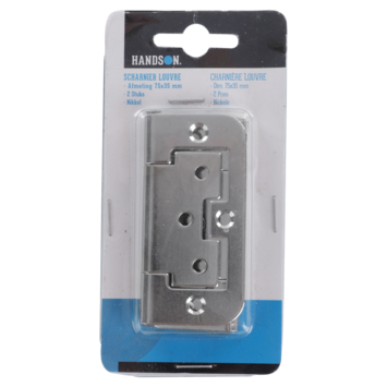 Dit type scharnier van HANDSON is een speciaal scharnier, namelijk een louvredeurscharnier. HANDSON scharnieren zijn soepel in gebruik en gaan lang mee. Het louvredeurscharnier is geschikt voor louvredeuren, klapdeuren en kasten. De maat van het scharnier is 75x35 mm en het scharnier is gemaakt van vernikkeld metaal. Van dit type scharnier is ook een vermessingde variant verkrijgbaar bij KARWEI In de verpakking zitten 2 scharnieren.