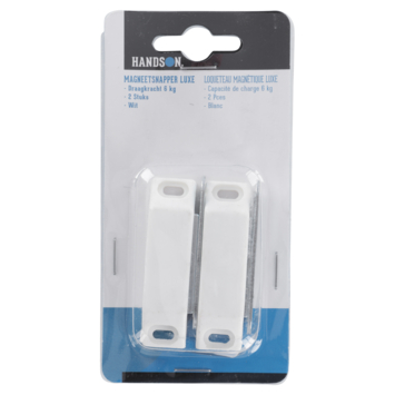 De HANDSON luxe magneetsluiting is een prima magneetslot om te gebruiken op kastdeurtjes in bijvoorbeeld de badkamer of keuken. De magneet heeft namelijk een kracht tot 6 kg, wat voldoende is voor de meeste kastdeurtjes in huis. De witte kunststof afwerking van het slot past mooi bij witte of lichtgekleurde kastjes. Het wordt per 2 stuks geleverd. Voor wat lichtere of donkergekleurde kastdeurtjes zijn ook magneetsluitingen te kopen bij KARWEI.