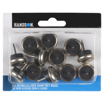 De HANDSON meubelglijders met nagel worden ook glijnagels genoemd. Deze glijnagels kun je gebruiken onder de stoelpoten wanneer je een zachte vloer hebt zoals tapijt. De glijnagels hebben een nikkel afwerking met een rubberen tussenlaag. Door het rubber heeft de glijnagel meer grip op de stoelpoot. De maat is Ø22 mm en in de verpakking zitten 12 stuks zodat je voldoende hebt voor 3 stoelen.