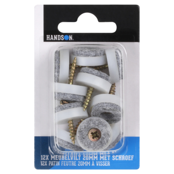 De HANDSON meubelglijders met schroef kun je gebruiken onder de (stoel)poten of meubelstukken wanneer je een harde vloer hebt zoals hout, laminaat, keramiek Het contactoppervlak van de meubelglijder is gemaakt van anti kras vilt en je bevestigt de meubelglijder gemakkelijk door de schroef in de (stoel)poot te schroeven. De maat is Ø20 mm en in de verpakking zitten 12 stuks in de kleur grijs.