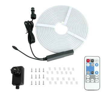 Ben je op zoek naar een unieke manier om je ruimte te verlichten? Deze Neon LED-strip biedt uitkomst! In tegenstelling tot standaard led strips, waarbij de individuele led-punten vaak zichtbaar zijn, geeft een neon LED-strip een egale en doorlopende lichtlijn. Dit zorgt voor een stijlvolle en strakke uitstraling, ideaal voor decoratieve en functionele toepassingen. Deze LED-strip kan op helder maar ook op warmwit (3000K) licht gezet worden. Hiermee dus eenvoudig aan te passen aan je stemming of gelegenheid. De LED strip is 5 meter lang en met de meegeleverde afstandsbediening te dimmen naar elk gewenste stand. Met een IP65-waarde is deze LED-strip geschikt voor buiten. De adapter heeft een IP44-waarde. Eenvoudige installatie, want de LED strip is voorzien van een plakstrip over de gehele lengte. De LED strip is niet in te korten!