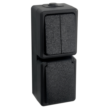 Deze combinatieschakelaar (wisselschakelaar en wandcontactdoos in één) met randaarde zwart is spatwaterdicht (beschermingsklasse IP44), dus geschikt voor montage in vochtige ruimtes of buitenshuis. Maximaal aansluitvermogen 2300 watt. Met een serieschakelaar kun je twee verschillende lichtpunten vanaf één plaats in- en uitschakelen, zoals berging- en buitenlamp.