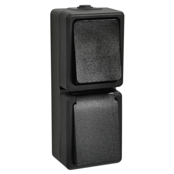 Deze combinatieschakelaar met randaarde zwart is spatwaterdicht (beschermingsklasse IP44), dus geschikt voor verticale montage in vochtige ruimtes of buitenshuis. Maximaal aansluitvermogen 2300 watt.