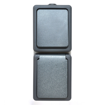Deze combinatieschakelaar met randaarde grijs/zwart is spatwaterdicht (beschermingsklasse IP44), dus geschikt voor verticale montage in vochtige ruimtes of buitenshuis. Maximaal aansluitvermogen 2300 watt.