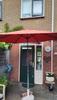 Parasol, die qua kleurstelling precies past in onze tuin....