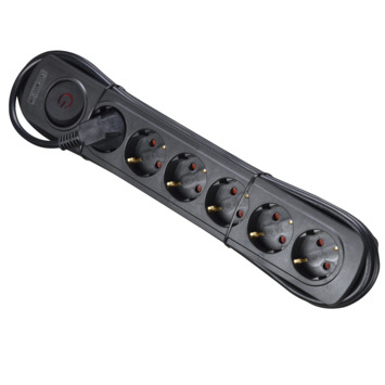 Op deze Handson Stekkerdoos 6-voudig RA Zwart 2,5 Meter bevinden zich 6 contactdozen waarop je maximaal 6 elektronische apparaten tegelijkertijd aansluit. Zo vergroot je het aantal stopcontacten in huis of op kantoor in een handomdraai. De zwarte stekkerdoos gebruik je onder meer om printers of computers aan te sluiten, maar bijvoorbeeld ook om huishoudelijke apparatuur in de keuken of bijkeuken van stroom te voorzien. Met behulp van de schakelaar schakel je de contactdozen zelf aan of uit.