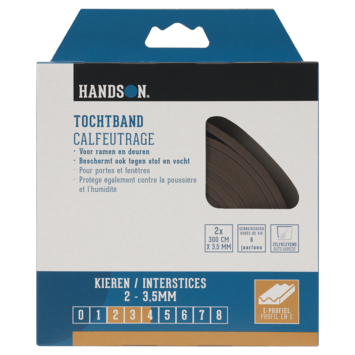 Met het Handson tochtband dicht je kieren en spleten bij ramen en deuren erg effectief. Dit bruine tochtband heeft een E-profiel en is hierdoor geschikt voor het afdichten van kleine kieren van 2 mm tot maximaal 3,5 mm. Zo houd je kou, stof en vocht effectief buiten de deur. Dit tochtband is gemaakt van EPDM-rubber en gaat hierdoor erg lang mee. Dankzij de zelfklevende plaklaag kan het tochtband gemakkelijk worden vastgeplakt in deur- of raamkozijn. In deze verpakking zitten 2 stuks van 3 meter lang.