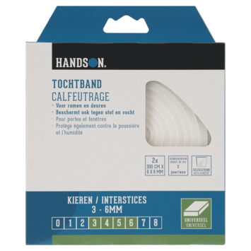 Met het Handson tochtband dicht je kieren en spleten bij ramen en deuren erg effectief. Dit witte tochtband is gemaakt van PU-schuim en heeft een rechthoekig profiel in de afmeting 6 bij 9 mm en is universeel voor vele kieren van 3 tot maximaal 6 mm te gebruiken. Zo houd je kou, stof en vocht effectief buiten de deur. Dankzij de zelfklevende plaklaag is de tochtstrip gemakkelijk vast te plakken in deur- of raamkozijn. In deze verpakking zitten 2 stuks van 3 meter lang.