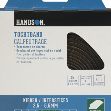 Met het Handson tochtband dicht je kieren en spleten bij ramen en deuren erg effectief. Dit antracietkleurige tochtband heeft een V-profiel en is hierdoor geschikt voor het afdichten van kleine kieren van 2,5 mm tot maximaal 5,5 mm. Zo houd je kou, stof en vocht effectief buiten de deur. Dit tochtband is gemaakt van EPDM-rubber en gaat hierdoor erg lang mee. Dankzij de zelfklevende plaklaag kan het tochtband gemakkelijk worden vastgeplakt in deur- of raamkozijn. In deze verpakking zitten 2 stuks van 3 meter lang.