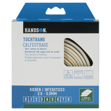 Met het Handson tochtband dicht je kieren en spleten bij ramen en deuren erg effectief. Dit witte tochtband heeft een V-profiel en is hierdoor geschikt voor het afdichten van kleine kieren van 2,5 mm tot maximaal 5,5 mm. Zo houd je kou, stof en vocht effectief buiten de deur. Dit tochtband is gemaakt van EPDM-rubber en gaat hierdoor erg lang mee. Dankzij de zelfklevende plaklaag kan het tochtband gemakkelijk worden vastgeplakt in deur- of raamkozijn. In deze verpakking zitten 2 stuks van 3 meter lang.