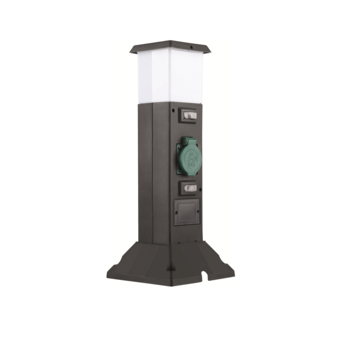 Eenvoudige en functionele tuinpaal. 2 stopcontacten en lamp bovenin.