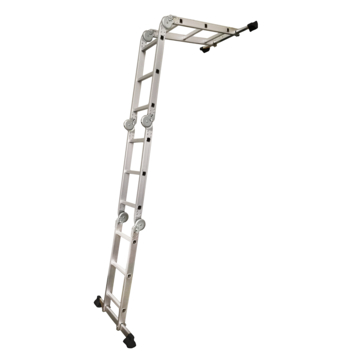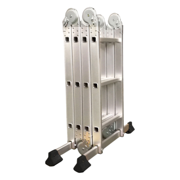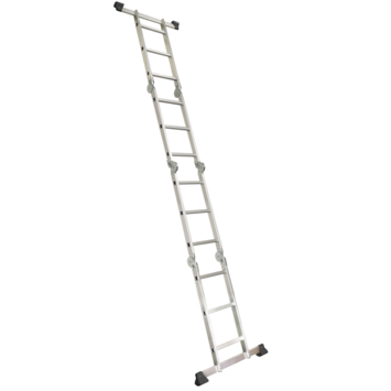 12 treden enkelvoudige ladder: In deze opstelling heeft de ladder een hoogte van 350 cm waardoor de werkhoogte maximaal 430 cm is. Door de brede stabiliteitsbalk aan de onderzijde staat de ladder ook erg stabiel.