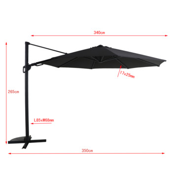 Je zoekt een parasol die niet alleen functioneel is, maar er ook nog eens goed uitziet? De Handson zweefparasol Menorca in het zwart is precies wat je nodig hebt! Met een diameter van 350 cm biedt deze parasol genoeg schaduw voor je tuinset of ligbed. Het unieke uitklapmechanisme met hendel maakt het eenvoudig om de parasol te openen en sluiten. Daarnaast is het frame van hoogwaardig aluminium, wat zorgt voor een stevige constructie. Het polyester doek beschermt je tegen de zon en houdt de kleuren mooi. Met een hoogte van 265 cm en een breedte van 350 cm past deze parasol perfect in elke buitenruimte. Dus neem plaats onder deze stijlvolle parasol en geniet van je tijd buiten zonder dat je last hebt van de zon.