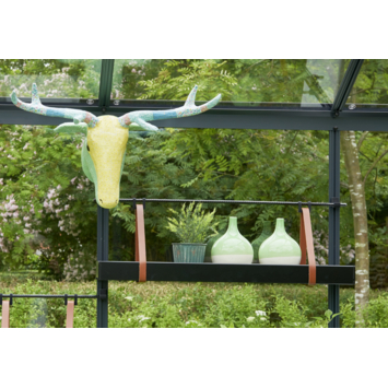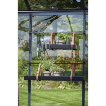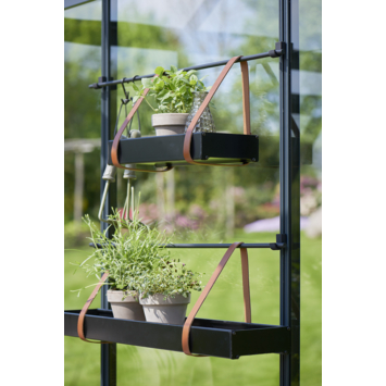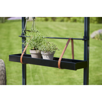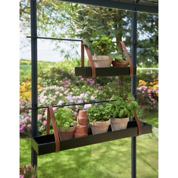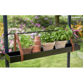 Deze aluminium kweekbak is zwart gecoat en 76 x 14,5 x 6 cm groot. De bak hangt in 2 banden waardoor deze eenvoudig afneembaar is voor het beplanten, onderhouden en watergeven. Planten aan de kaswand brengen sfeer en een aangenaam kasklimaat.