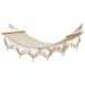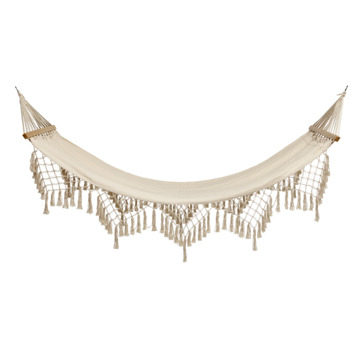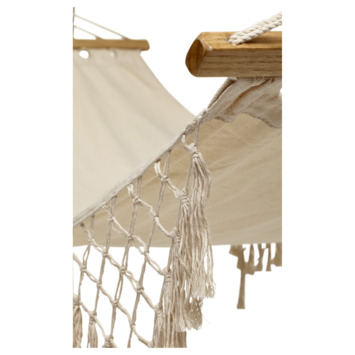 Met deze hangmat met franjes 200x100 cm is het heerlijk ontspannen in de tuin. Aan de korte zijden wordt de hangmat afgesloten met houtjes, waarna de draden zich vormen naar één draad dat je rondom de boom knoopt. De hangmat met franjes heeft een lengte van 200 centimeter en een breedte van 100 centimeter.