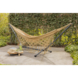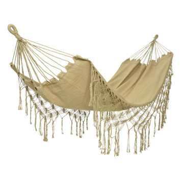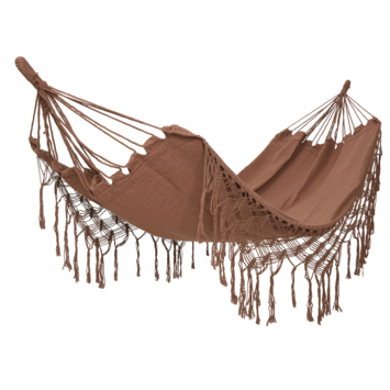 De hangmat is gemaakt van katoen en polyester en heeft een bohemiam style met kwastjes ter decoratie. Hij komt in de kleur naturel of terra.