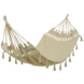 De hangmat is gemaakt van katoen en polyester en heeft een bohemiam style met kwastjes ter decoratie. Hij komt in drie kleuren inclusief handige draagtas.