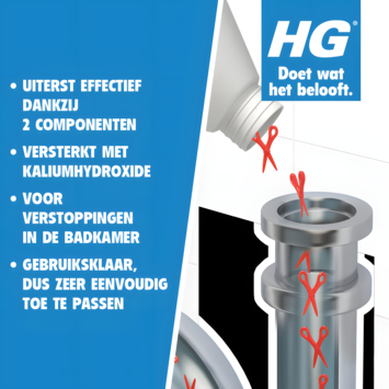 HG haarontstopper lost verstoppingen op in de badkamerafvoer door haren, zeepresten, huidvetten en tandpasta. Het is geschikt voor de doucheput, wasbak of ligbad. In de badkamer zijn haren dé veroorzaker van verstoppingen van zowel wasbak, douche als bad. Dit wordt nog eens verergerd door zeepresten, huidvetten en tandpasta die de haren vasthouden. HG haar ontstopper is versterkt met kaliumhydroxide en lost haren snel, effectief en volledig op, alsook alle materialen die ze tegenhouden.