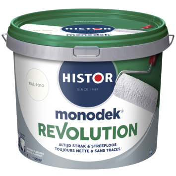 De Histor Monodek Revolution RAL 9010 gebroken wit 5 liter is een revolutie in muurverf. Door de Intelligent Flow Technology™ vloeien de lagen naadloos in het elkaar over. Dit zorgt voor een strak en streeploos resultaat! Deze verf is mat, geeft een optimale dekking, is geurarm en afwasbaar. Histor Monodek Revolution geeft een fris en mooi resultaat op glasweefselbehang, metselwerk, pleister- en stucwerk, beton, (voorbehandelde) gips- en boardplaten en kan gewoon over bestaande verflagen geschilderd worden.