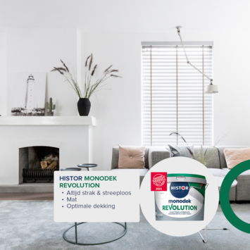 De Histor Monodek Revolution RAL 9010 gebroken wit 5 liter is een revolutie in muurverf. Door de Intelligent Flow Technologyâ„¢ vloeien de lagen naadloos in het elkaar over. Dit zorgt voor een strak en streeploos resultaat! Deze verf is mat, geeft een optimale dekking, is geurarm en afwasbaar. Histor Monodek Revolution geeft een fris en mooi resultaat op glasweefselbehang, metselwerk, pleister- en stucwerk, beton, (voorbehandelde) gips- en boardplaten en kan gewoon over bestaande verflagen geschilderd worden.