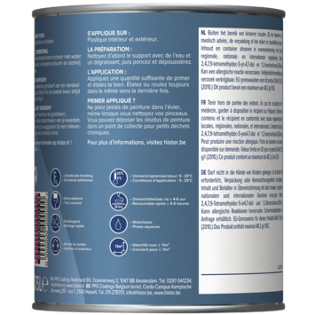 De Histor Perfect Base grondverf kunststof wit 750 ml zorgt ervoor dat vloeren, kozijnen, trappen, hekwerken en deuren binnen en buiten goed voorbereid zijn voor het schilderen. Deze grondverf hecht sterk op kunststof en dekt extra goed zodat je een stevige basis hebt voor de eindlaag. Deze watergedragen grondverf kun je gebruiken bij temperaturen tussen de 5 en 25 graden. De verf is na 6 uur droog en dan kun je verder schilderen. Met een rendement van 15 m² per liter maak je makkelijk een goede ondergrond voor de volgende verflaag.