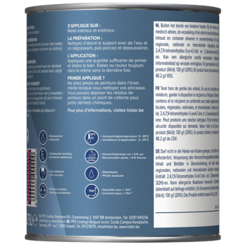 De Histor Perfect Base grondverf metaal wit 750 ml zorgt ervoor dat je metalen deuren, hekwerken, trappen, kozijnen, verwarmingsbuizen en radiatoren binnen en buiten goed voorbereid zijn op het schilderen. De Histor Perfect Base grondverf metaal wit 250 ml hecht uitstekend en dekt extra goed zodat je met een stevige ondergrond verder kunt werken. Deze watergedragen grondverf is roestwerend en beschermt het metaal tegen roestvorming. Je kunt de verf verwerken bij temperaturen tussen de 5 en 25 graden. De verf droogt in 6 uur en is daarna klaar om overgeschilderd te worden. Met een rendement van 15 m² per liter leg je een sterke basis voor de eindlaag.