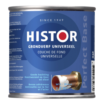Histor Perfect Base grondverf universeel wit 250 ml is een witte grondverf die op vele ondergronden als eerste laag terecht kan om hechting van de toplaag te verbeteren. Weet je dus niet precies van wat voor materiaal de ondergrond is die je gaat schilderen? Neem geen risico, de Histor Perfect Base kan terecht op hout, hard pvc, glasvezelversterkt polyester, zink, verzinkt staal, aluminium en de roestwerende laag op ijzer en staal. En omdat de grondverf ook nog eens sneldrogend is heb je snel een mooi begin van voor het eindresultaat.