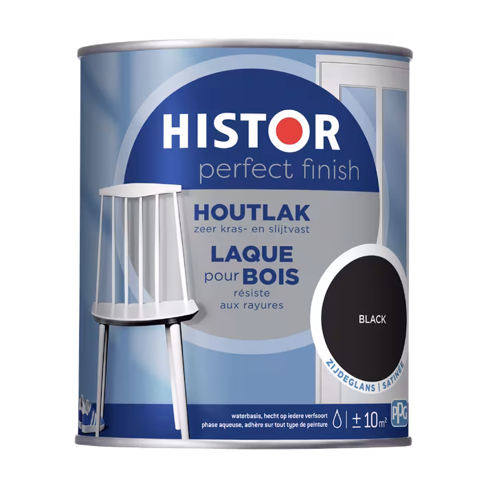 Histor Perfect Finish houtlak zijdeglans RAL 9005 zwart 750 ml is geschikt voor het aflakken van hout, metaal en kunststof. De lak is zeer kras- en slijtvast en extra dekkend. De lak is op waterbasis en kan gebruikt worden over elke vorige verfsoort heen, dus ook over terpentineverf. De verf is makkelijk aan te brengen en is sneldrogend. Na 1 uur is de verf stofdroog en na 5 uur overschilderbaar. Verf op terpentinebasis in lichte kleuren kan bij weinig daglicht vergelen. Histor Perfect Finish is dan de beste keuze, deze watergedragen houtlak vergeelt niet en behoudt zijn kleur. Daarnaast is de verf geurarm. Naast de kant-en-klare kleuren is deze verf in iedere gewenste kleur te mengen bij de verfmengbalie in de Karwei bouwmarkt. 1 blik van 750 ml is voldoende voor ongeveer 10m2.