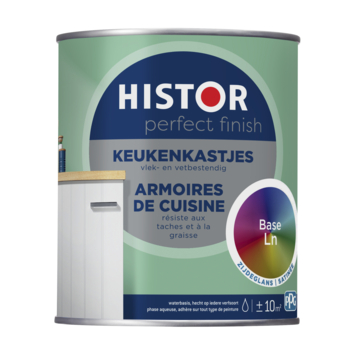 Histor Perfect Finish keukenkastjes is speciaal ontwikkeld voor het schilderen van houten of kunststof keukenkastjes. De lak is zeer geschikt voor gebruik in de keuken, want hij is vlek- en vetbestendig. Daarnaast is hij kras- en slijtvast en goed afneembaar. De lak is op waterbasis en kan gebruikt worden over elke vorige verfsoort heen, dus ook over terpentineverf. De verf is makkelijk aan te brengen en is sneldrogend. Na 1 uur is de verf stofdroog en na 5 uur overschilderbaar. Deze verf is alleen te mengen in lichte kleuren.
