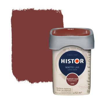 Histor Perfect Finish lak mat baskisch rood 750 ml is een lak met een mooie, zachte en neutrale uitstraling die geschikt is voor zowel binnen- als buitengebruik. Eenvoudig aan te brengen met kwast of roller. De lak dekt snel en slijt langzaam. Daardoor hoef je minder vaak te schilderen en heb je minder verf nodig. De vierkante pot is makkelijk te openen en sluiten, makkelijk schenkbaar en makkelijk vast te houden. Histor Perfect Finish is verkrijgbaar in kant-en-klare kleuren, maar ook in iedere andere kleur op de mengmachine.