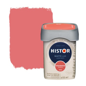 Histor Perfect Finish lak mat verbondenheid 750 ml is een lak met een mooie, zachte en neutrale uitstraling die geschikt is voor zowel binnen- als buitengebruik. Eenvoudig aan te brengen met kwast of roller. De lak dekt snel en slijt langzaam. Daardoor hoef je minder vaak te schilderen en heb je minder verf nodig. De vierkante pot is makkelijk te openen en sluiten, makkelijk schenkbaar en makkelijk vast te houden. Histor Perfect Finish is verkrijgbaar in kant-en-klare kleuren, maar ook in iedere andere kleur op de mengmachine.