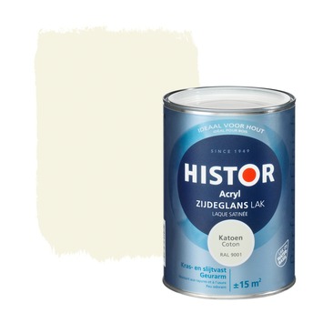 Histor Perfect Finish lak zijdeglans RAL9001 Katoen 1,25L is een lak met een mooie, lichte glans, tussen hoogglans en mat in, en heeft een egaal aanzien. De verf is watergedragen en dat betekent dat je de verf met water kan verdunnen en je geen vervelende verfluchtjes meer hebt. De lak is voor binnenshuis, dekt goed en is kras- en slijtvast waardoor je minder snel weer hoeft te schilderen en uiteindelijk minder verf nodig hebt. Dat maakt de verf geschikt voor oppervlakten die tegen een stootje moeten kunnen, zoals deuren, kozijnen, plinten of meubelen. Histor Perfect Finish is verkrijgbaar in kant-en-klare kleuren, maar ook in jouw eigen favoriete kleur op de mengmachine.