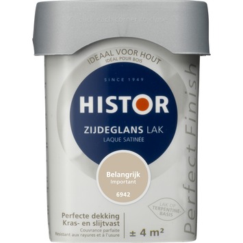 Histor Perfect Finish lak zijdeglans belangrijk 250 ml is een lak met een mooie lichte glans, tussen hoogglans en mat in en heeft een egaal aanzien. De lak kan zowel binnen als buiten gebruikt worden op een ondergrond van hout, of op een andere ondergrond voorzien van een voorgaande (grond)verflaag of plamuurlaag voorzien van grondverf. De lak dekt goed en is kras- en slijtvast waardoor je minder snel weer hoeft te schilderen en uiteindelijk minder verf nodig hebt. Dat maakt de verf geschikt voor oppervlakten die tegen een stootje moeten kunnen, zoals deuren, kozijnen, plinten of meubelen. De vierkante pot is makkelijk te openen en sluiten, makkelijk schenkbaar en makkelijk vast te houden. Histor Perfect Finish is verkrijgbaar in kant-en-klare kleuren, maar ook in jouw eigen favoriete kleur op de mengmachine.