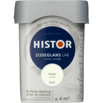 Histor Perfect Finish lak zijdeglans ivoor 250 ml is een lak met een mooie lichte glans, tussen hoogglans en mat in en heeft een egaal aanzien. De lak kan zowel binnen als buiten gebruikt worden op een ondergrond van hout, of op een andere ondergrond voorzien van een voorgaande (grond)verflaag of plamuurlaag voorzien van grondverf. De lak dekt goed en is kras- en slijtvast waardoor je minder snel weer hoeft te schilderen en uiteindelijk minder verf nodig hebt. Dat maakt de verf geschikt voor oppervlakten die tegen een stootje moeten kunnen, zoals deuren, kozijnen, plinten of meubelen. De vierkante pot is makkelijk te openen en sluiten, makkelijk schenkbaar en makkelijk vast te houden. Histor Perfect Finish is verkrijgbaar in kant-en-klare kleuren, maar ook in jouw eigen favoriete kleur op de mengmachine.