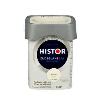 Histor Perfect Finish lak zijdeglans katoen 250 ml is een lak met een mooie lichte glans, tussen hoogglans en mat in en heeft een egaal aanzien. De lak kan zowel binnen als buiten gebruikt worden op een ondergrond van hout, of op een andere ondergrond voorzien van een voorgaande (grond)verflaag of plamuurlaag voorzien van grondverf. De lak dekt goed en is kras- en slijtvast waardoor je minder snel weer hoeft te schilderen en uiteindelijk minder verf nodig hebt. Dat maakt de verf geschikt voor oppervlakten die tegen een stootje moeten kunnen, zoals deuren, kozijnen, plinten of meubelen. De vierkante pot is makkelijk te openen en sluiten, makkelijk schenkbaar en makkelijk vast te houden. Histor Perfect Finish is verkrijgbaar in kant-en-klare kleuren, maar ook in jouw eigen favoriete kleur op de mengmachine.