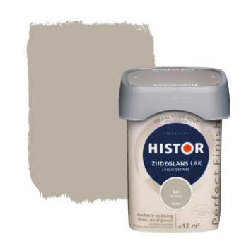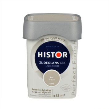 Histor Perfect Finish lak zijdeglans lei 750 ml is een lak met een mooie, lichte glans, tussen hoogglans en mat in, en heeft een egaal aanzien. De lak kan zowel binnen als buiten gebruikt worden op een ondergrond van hout, of op een andere ondergrond voorzien van een voorgaande (grond)verflaag of plamuurlaag voorzien van grondverf. De lak dekt goed en is kras- en slijtvast waardoor je minder snel weer hoeft te schilderen en uiteindelijk minder verf nodig hebt. Dat maakt de verf geschikt voor oppervlakten die tegen een stootje moeten kunnen, zoals deuren, kozijnen, plinten of meubelen. De vierkante pot is makkelijk te openen en sluiten, makkelijk schenkbaar en makkelijk vast te houden. Histor Perfect Finish is verkrijgbaar in kant-en-klare kleuren, maar ook in jouw eigen favoriete kleur op de mengmachine.