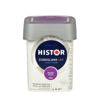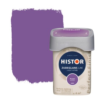 Histor Perfect Finish lak zijdeglans purper 250 ml is een lak met een mooie lichte glans, tussen hoogglans en mat in en heeft een egaal aanzien. De lak kan zowel binnen als buiten gebruikt worden op een ondergrond van hout, of op een andere ondergrond voorzien van een voorgaande (grond)verflaag of plamuurlaag voorzien van grondverf. De lak dekt goed en is kras- en slijtvast waardoor je minder snel weer hoeft te schilderen en uiteindelijk minder verf nodig hebt. Dat maakt de verf geschikt voor oppervlakten die tegen een stootje moeten kunnen, zoals deuren, kozijnen, plinten of meubelen. De vierkante pot is makkelijk te openen en sluiten, makkelijk schenkbaar en makkelijk vast te houden. Histor Perfect Finish is verkrijgbaar in kant-en-klare kleuren, maar ook in jouw eigen favoriete kleur op de mengmachine.
