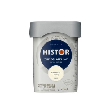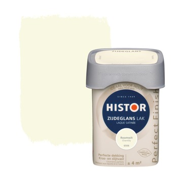 Histor Perfect Finish lak zijdeglans roomwit 250 ml is een lak met een mooie lichte glans, tussen hoogglans en mat in en heeft een egaal aanzien. De lak kan zowel binnen als buiten gebruikt worden op een ondergrond van hout, of op een andere ondergrond voorzien van een voorgaande (grond)verflaag of plamuurlaag voorzien van grondverf. De lak dekt goed en is kras- en slijtvast waardoor je minder snel weer hoeft te schilderen en uiteindelijk minder verf nodig hebt. Dat maakt de verf geschikt voor oppervlakten die tegen een stootje moeten kunnen, zoals deuren, kozijnen, plinten of meubelen. De vierkante pot is makkelijk te openen en sluiten, makkelijk schenkbaar en makkelijk vast te houden. Histor Perfect Finish is verkrijgbaar in kant-en-klare kleuren, maar ook in jouw eigen favoriete kleur op de mengmachine.
