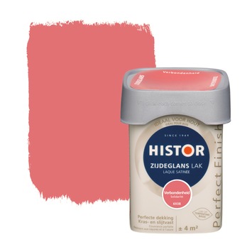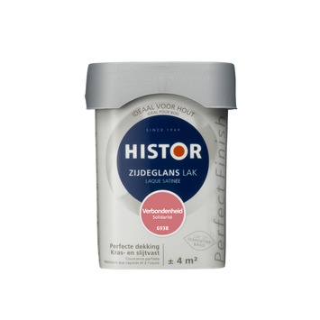 Histor Perfect Finish lak zijdeglans verbondenheid 250 ml is een lak met een mooie lichte glans, tussen hoogglans en mat in en heeft een egaal aanzien. De lak kan zowel binnen als buiten gebruikt worden op een ondergrond van hout, of op een andere ondergrond voorzien van een voorgaande (grond)verflaag of plamuurlaag voorzien van grondverf. De lak dekt goed en is kras- en slijtvast waardoor je minder snel weer hoeft te schilderen en uiteindelijk minder verf nodig hebt. Dat maakt de verf geschikt voor oppervlakten die tegen een stootje moeten kunnen, zoals deuren, kozijnen, plinten of meubelen. De vierkante pot is makkelijk te openen en sluiten, makkelijk schenkbaar en makkelijk vast te houden. Histor Perfect Finish is verkrijgbaar in kant-en-klare kleuren, maar ook in jouw eigen favoriete kleur op de mengmachine.