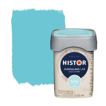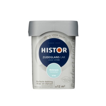 Histor Perfect Finish lak zijdeglans waterpas 750 ml is een lak met een mooie, lichte glans, tussen hoogglans en mat in, en heeft een egaal aanzien. De lak kan zowel binnen als buiten gebruikt worden op een ondergrond van hout, of op een andere ondergrond voorzien van een voorgaande (grond)verflaag of plamuurlaag voorzien van grondverf. De lak dekt goed en is kras- en slijtvast waardoor je minder snel weer hoeft te schilderen en uiteindelijk minder verf nodig hebt. Dat maakt de verf geschikt voor oppervlakten die tegen een stootje moeten kunnen, zoals deuren, kozijnen, plinten of meubelen. De vierkante pot is makkelijk te openen en sluiten, makkelijk schenkbaar en makkelijk vast te houden. Histor Perfect Finish is verkrijgbaar in kant-en-klare kleuren, maar ook in jouw eigen favoriete kleur op de mengmachine.