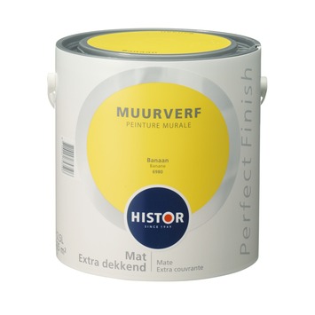 Histor Perfect Finish muurverf mat banaan 2,5 l is een matte muurverf op basis van water. Breng je muren tot leven met deze of één van de andere 48 prachtige vrolijke, lichte, vergrijsde of donkere kleuren uit het kant-en-klaar assortiment. Het kleurenpalet van Histor Perfect Finish is zo opgebouwd dat je in een handomdraai de mooiste kleurencombinaties kunt maken; van rustige ton-sur-ton tot uitgesproken kleurcontrasten. En als jouw favoriete kleur niet bij de kant-en-klaar kleuren zit, kun je je kleur laten mengen in extra mat, mat of glans. Je hebt keuze uit wel 1250 Histor kleuren. Voor het beste, meest egale resultaat gebruik je eerst Histor dekkende muur voorstrijk.